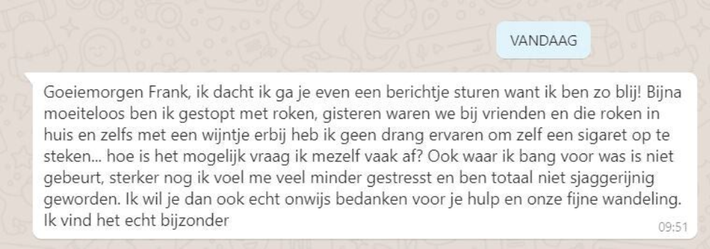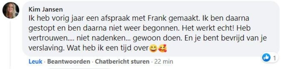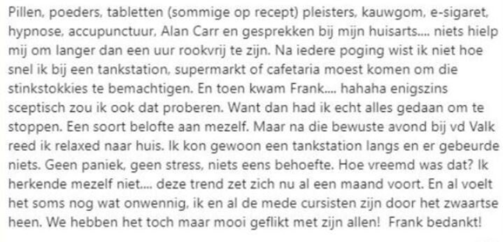 Tjeerd (57) rookte vanaf zijn twintigste. Hij is nooit gestopt, tot hij aan het eind van de zomer bij zijn vaste kapster kwam. Samen rookten ze na het knippen altijd een sjekkie, maar tot zijn verbazing zag hij dat de asbak weg was. Vragend keek hij haar aan. ‘Ik ben gestopt met roken’ zei ze. ‘Jij? Gestopt? Hoe dan?’ vroeg Tjeerd. Haar antwoord was kort maar krachtig: ‘Door Frank’.