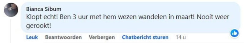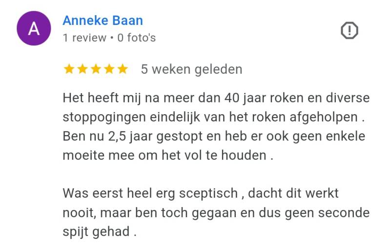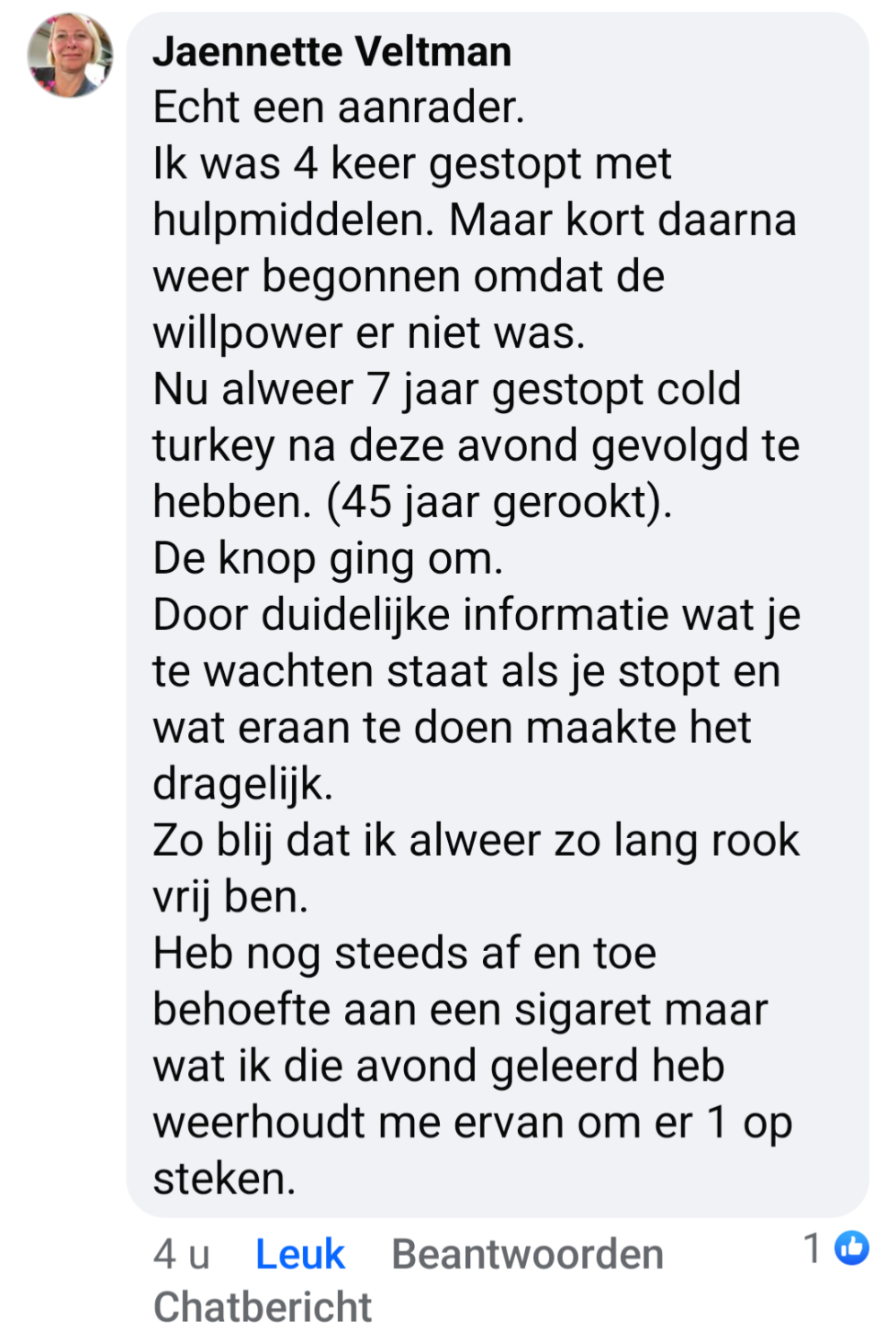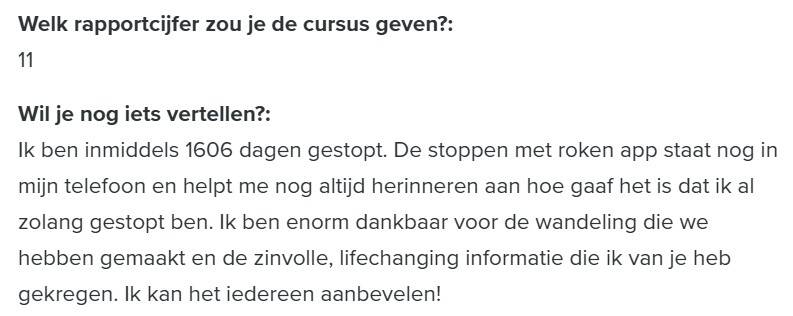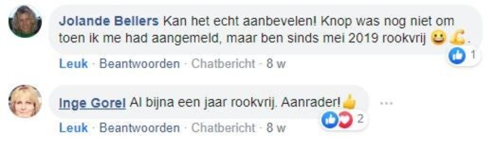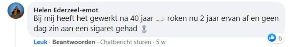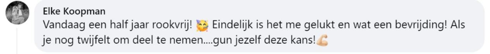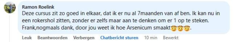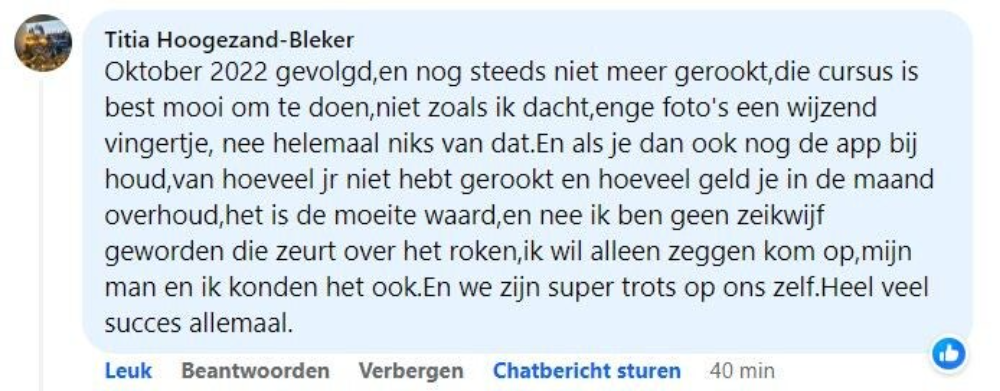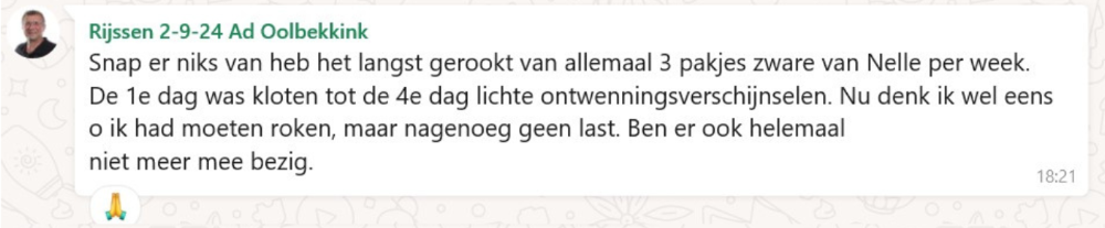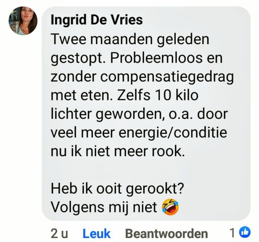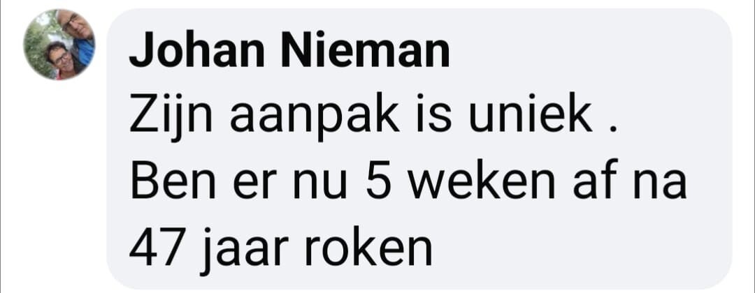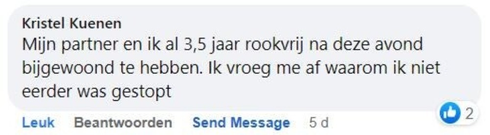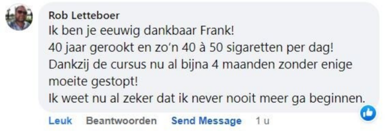 ‘Ik rookte 40 jaar lang, waarvan de laatste jaren zelfs 40 tot 50 sigaretten per dag, vertelt Rob. ‘Geen persoon op de wereld kon mij laten stoppen met roken. Maar toen zag ik een advertentie voorbijkomen van ‘ook jij kan stoppen’ waarin stond dat je je geld terug kreeg als je na de cursus niet was gestopt. Ik dacht: ‘baat het niet dan schaadt het niet’ en ik ging erheen. Na die cursusavond heb ik nooit meer gerookt.’