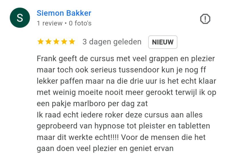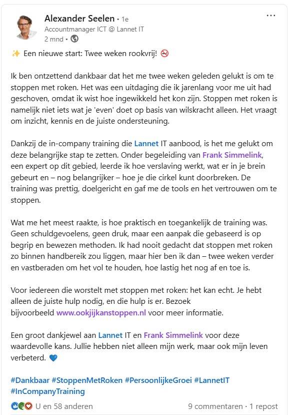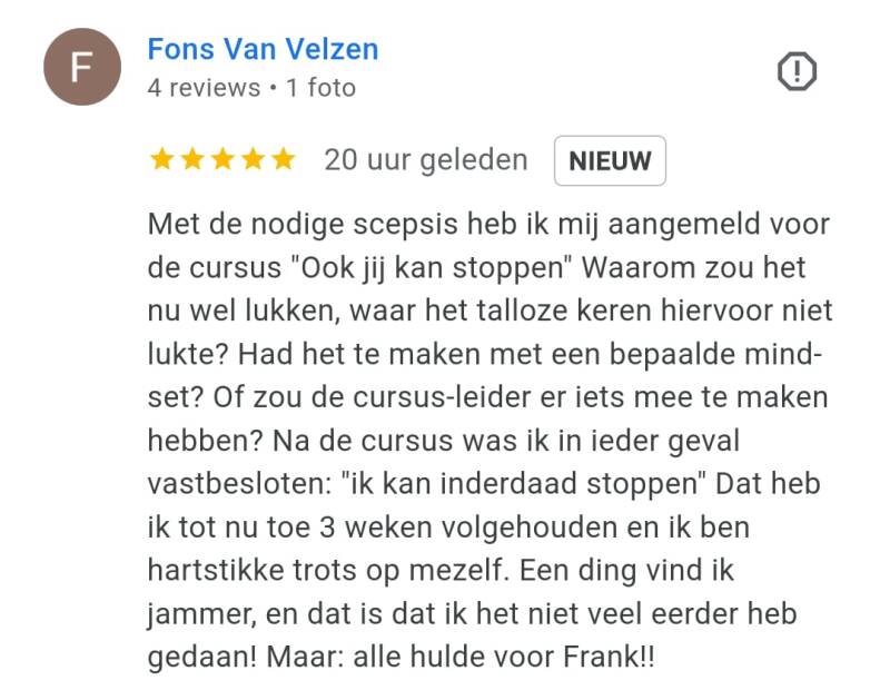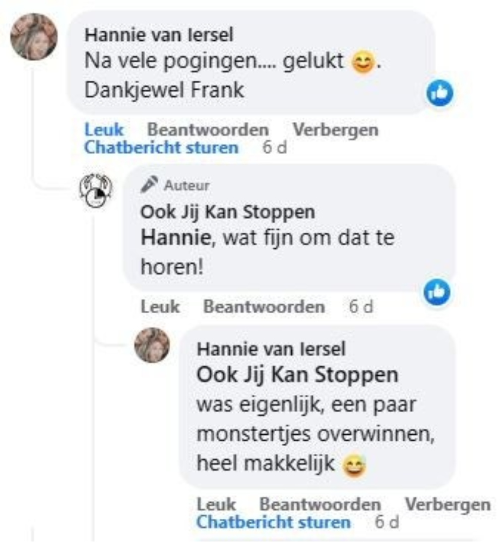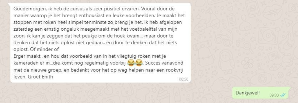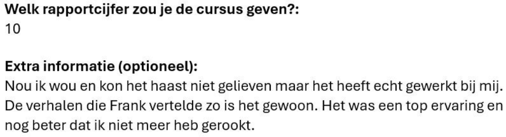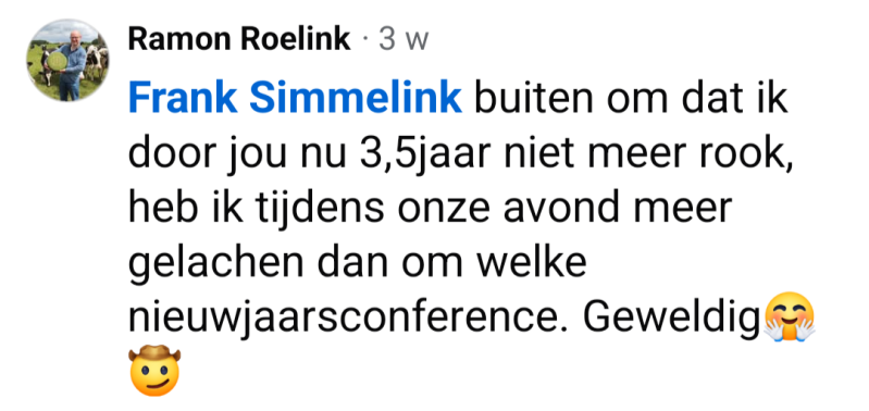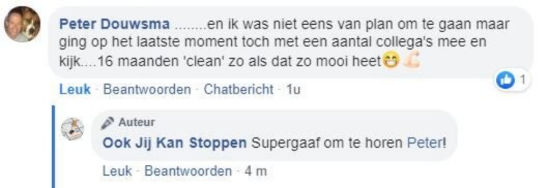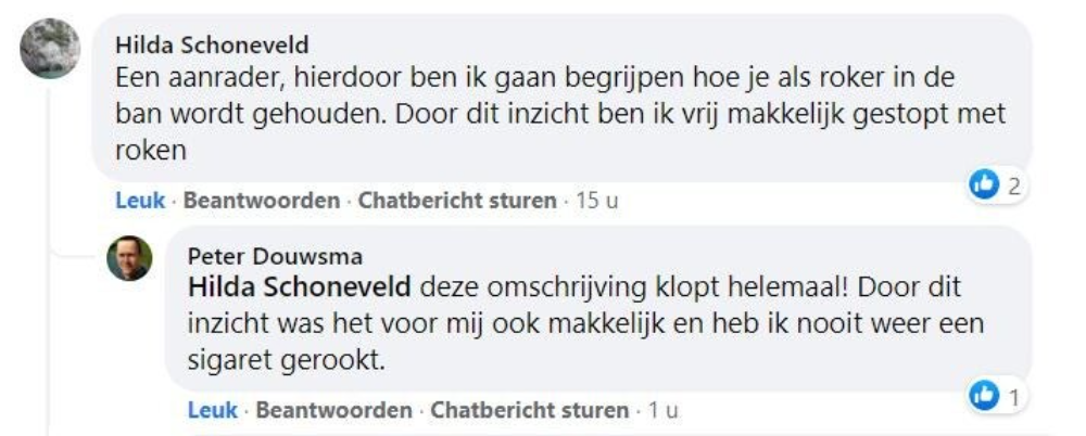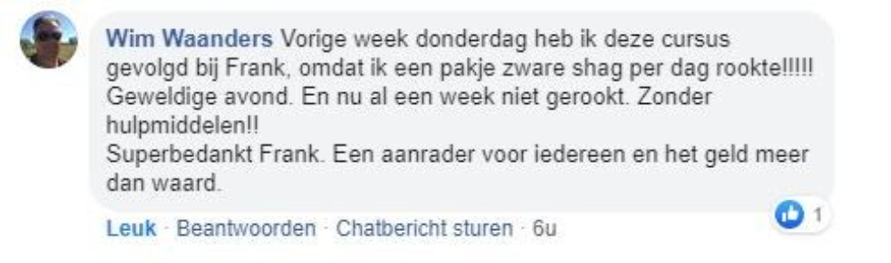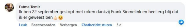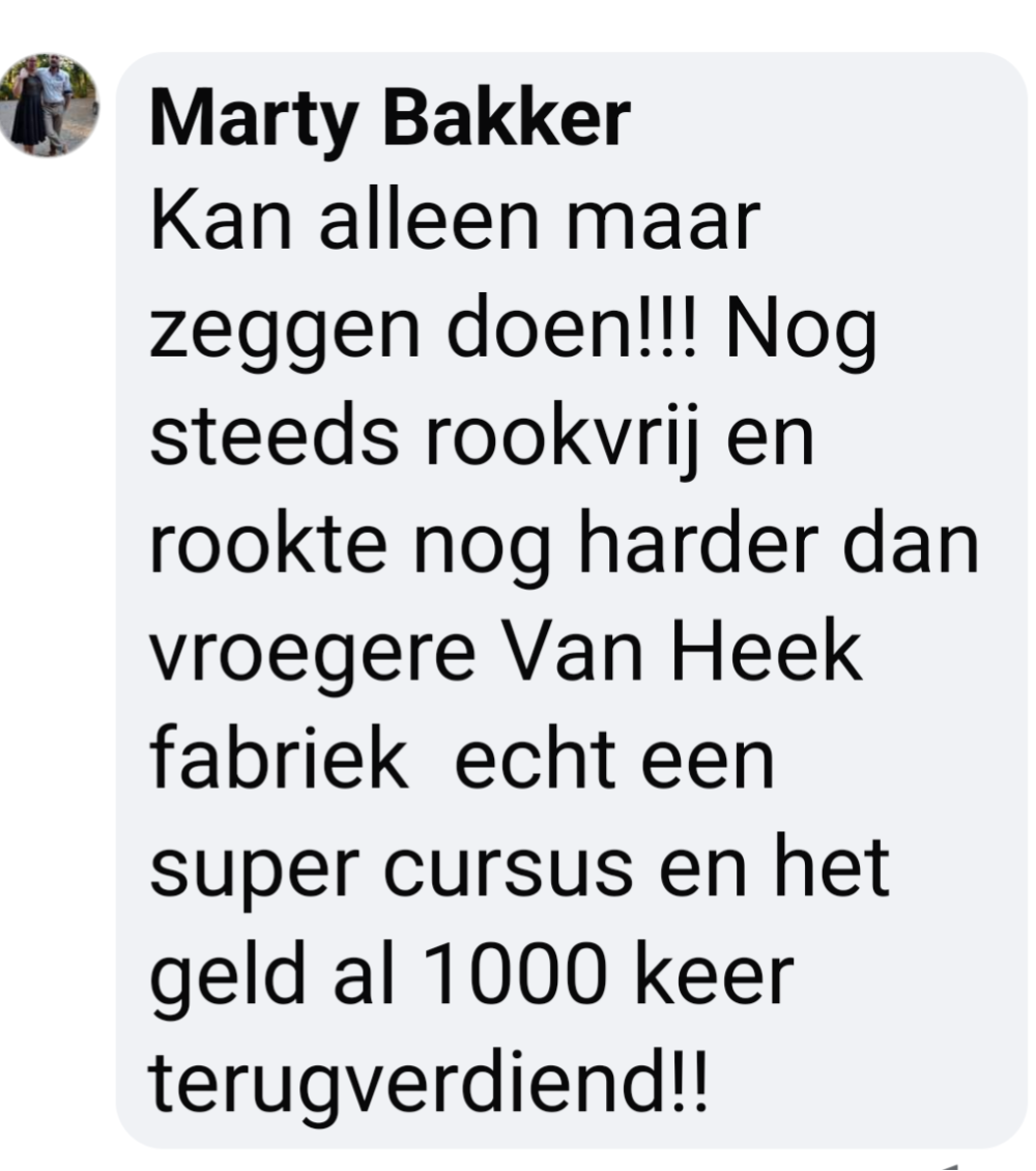 Toen hij dat hoorde melde hij zich direct aan voor een trainingsavond van ‘Ook jij kan stoppen’, de onderneming van Frank. ‘We hebben in een deuk gelegen om zijn humoristische vertelwijze en hebben aandachtig geluisterd naar zijn persoonlijke verhaal’, vertelt Tjeerd. ‘Aan het eind van de avond zei Frank: ‘rook nu zoveel als je wilt, daarna is het gedaan’. ‘Na die avond heb ik nooit meer gerookt’, zegt Tjeerd trots.