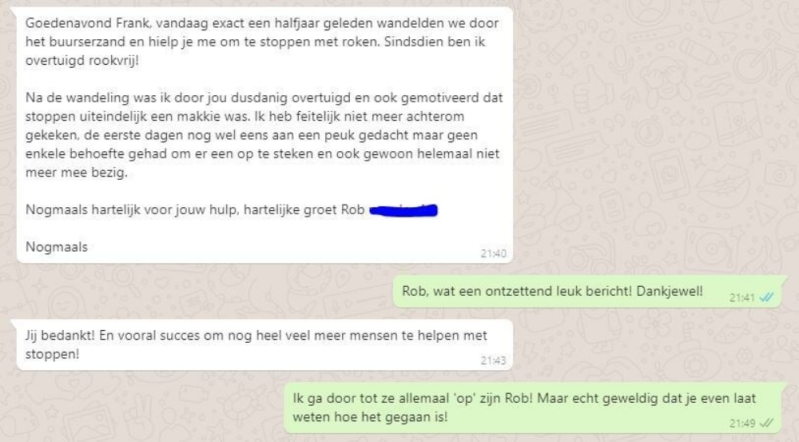 ‘Het leek wel een betovering of een hypnose, Frank wist precies wat er ging gebeuren in het traject om te stoppen,’ lacht Rob. ‘Op de cursusavond kregen we allerlei handige tips mee om door de moeilijke momenten te komen. Drink een glas water als je zin hebt in een peuk of tel tot 180, want dat is precies de tijd die jij doet over een sigaret’.