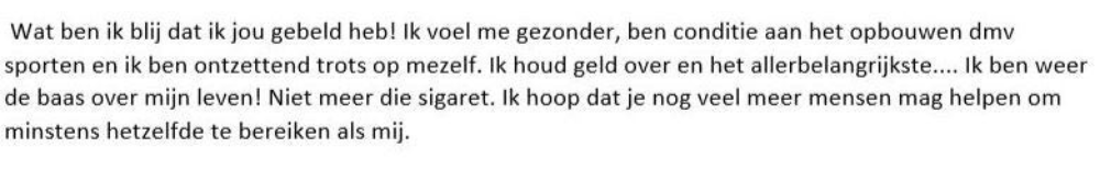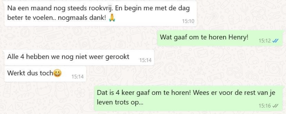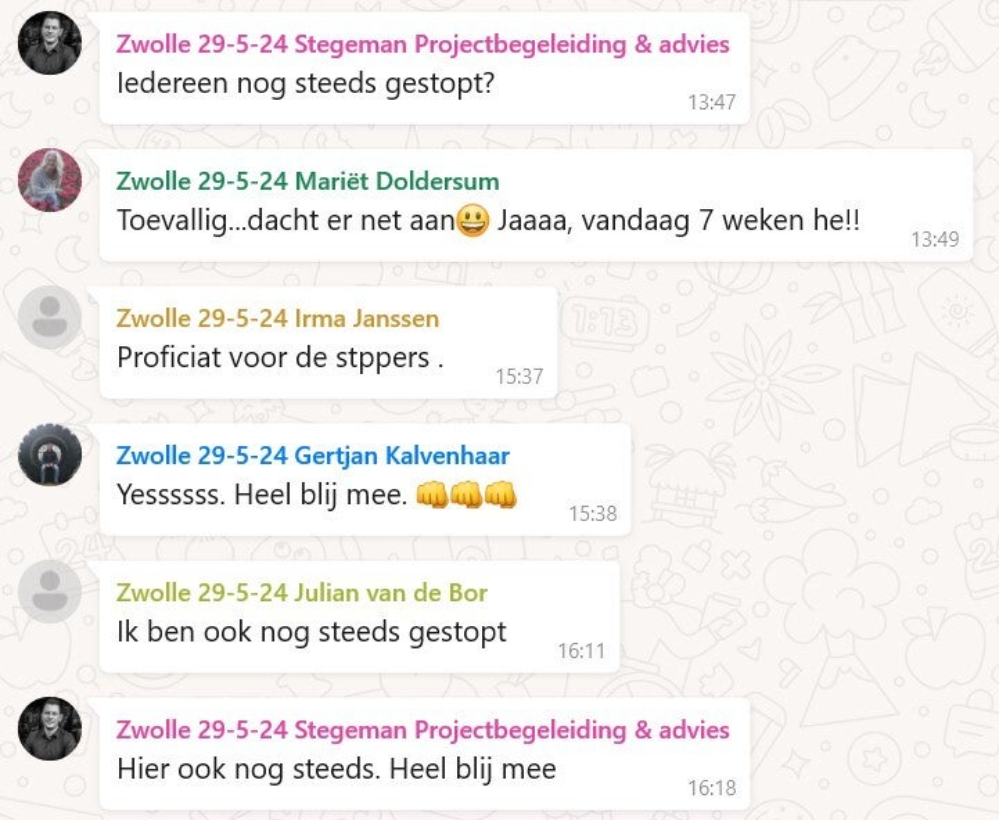 Ook zorgt het stoppen met roken voor veel minder stress bij Tjeerd. ‘Mensen denken juist dat ze stress krijgen van het stoppen met roken, dat ze iedere keer verlangen naar een sigaret, dat ze elk moment bang zijn voor een terugval, vertelt hij. ‘Ik zeg je nu: stress wordt juist veroorzaakt door het roken zelf. Rotdag? Even een peukje. Moeilijke klus op het werk? Even een sjekkie. Maar over een half uur heb je weer zin in een sigaret. Sinds ik gestopt ben ben ik ook mijn stress kwijt. Ik hoef nu niet meer want ik rook niet meer.’